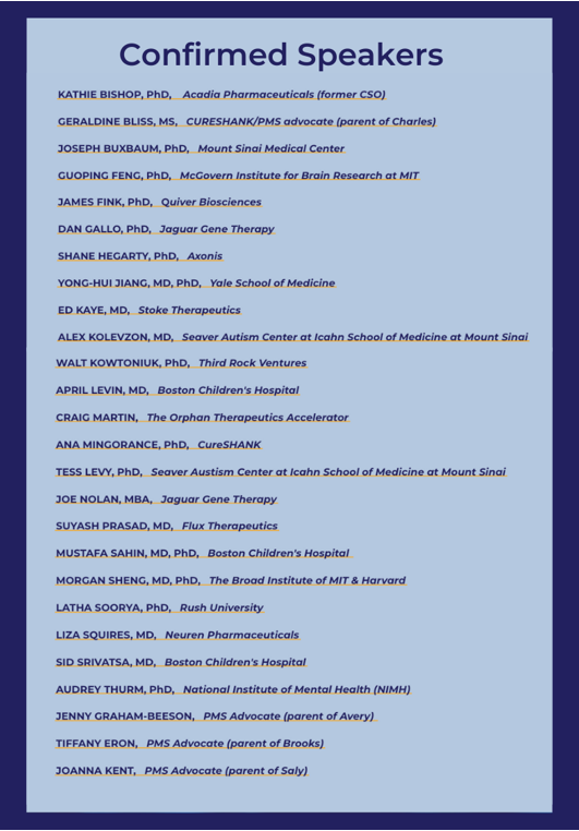 Full day of talks addressing the most critical questions in drug development for Phelan-McDermid syndrome. Breakfast and lunch included; concludes at 4pm.